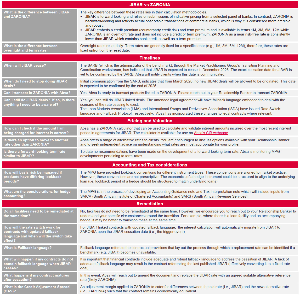 Row rect Shape Decorative svg added to bottom From JIBAR to ZARONIA. Embracing a new era in South African financial benchmarking Tailored Advice Absa | Corporate and Investment Banking > Insights and Events > Zaronia Benchmark Reform South Africa’s financial realm is undergoing a significant shift from the Johannesburg Interbank Average Rate (JIBAR) to the South African Overnight Index Average (ZARONIA). This transition is part of a broader global initiative to reform benchmark rates, echoing the recent phasing out of other Interbank Offered Rates (IBOR) such as the London Interbank Offered Rate (LIBOR) and the Euro Overnight Index Average (EONIA). To view the ZARONIA transition timelines specific to the South African market, please click here. What is Benchmark Reform and why is it needed? Benchmark Reform is a global initiative to enhance the stability and reliability of benchmark rates that underpin financial transactions. The initiative is aimed at improving the transparency and strengthening the credibility of existing benchmarks, such as JIBAR (and the other phased-out IBOR that were replaced with various risk-free overnight indices), to ensure a more robust and trustworthy financial system. The International Organization of Securities Commissions (IOSCO) have specified principles that allow for greater confidence in setting rates. "Risk free" rates have been identified as alternative rates. Absa's ZARONIA calculator The Absa ZARONIA calculator is available for use here. For detailed information on the construction of the ZARONIA rate and its distinctions from JIBAR, please click here to access more comprehensive insights. Try the ZARONIA calculator LIBOR and JIBAR were identified as non-compliant with IOSCO principles. The LIBOR transition to "risk free" rates has since been concluded. South Africa is now preparing for the same reform coordinated through the SARB's establishment of a Market Practitioners' Group (MPG). JIBAR is expected to cease December 2026 and will be replaced with ZARONIA. What is the Absa ZARONIA calculator The ZARONIA calculator computes interest and interest payments for ZARONIA-linked financial products, for both single and multi-period instruments. What products can the calculator be used for? The calculator applies conventions for loans, money market funds, bonds and derivatives as endorsed by the SARB, but also allows for some flexibility. 1. Although conventions have been endorsed by the SARB, they are not prescriptive. What should the calculator be used for? By leveraging our deep regional knowledge – and our advisory, financing and capital raising expertise – our award-winning global team will tailor an ideal solution for your needs. Frequently Asked Questions Meet our team Ajay Bhowan Head of Treasury Execution Services (& Absa Bank Treasurer) Kumeshen Naidoo Head: Debt Capital Markets Ben Wiese Head Client Value Management Nonhlanhla Zwane Head: CIB Legal Investment Banking Division Related articles Unlocking your potential with insight and sustainable solutions. RISK MANAGEMENT JIBAR Reform The SARB’s Market Practitioners Group has endorsed that the South African interest rate market adopts a Credit Adjustment Spread (CAS) estimation methodology, consistent with international practices and based on ISDA’s recommendation. Read more RISK MANAGEMENT Benchmark Reform | Assistance with publications On 29 November 2024, the Market Practitioners Group published three significant consultation papers, based on the recommendations of various working groups. The Read more